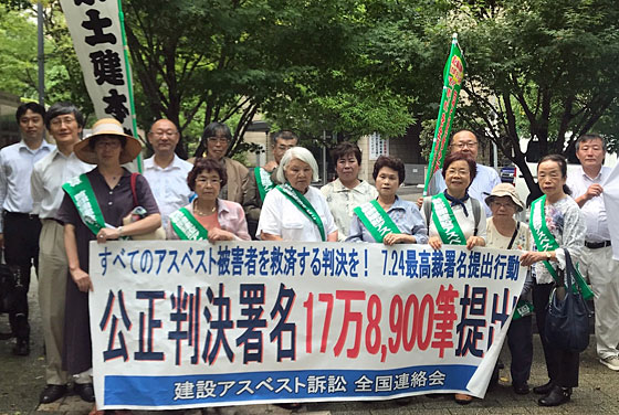 7月24日、「建設アスベスト訴訟で原告全員を救済する判決を」と、全国から寄せられた署名を最高裁に届け、累計17万8900筆に。公正な判決を要請しました。